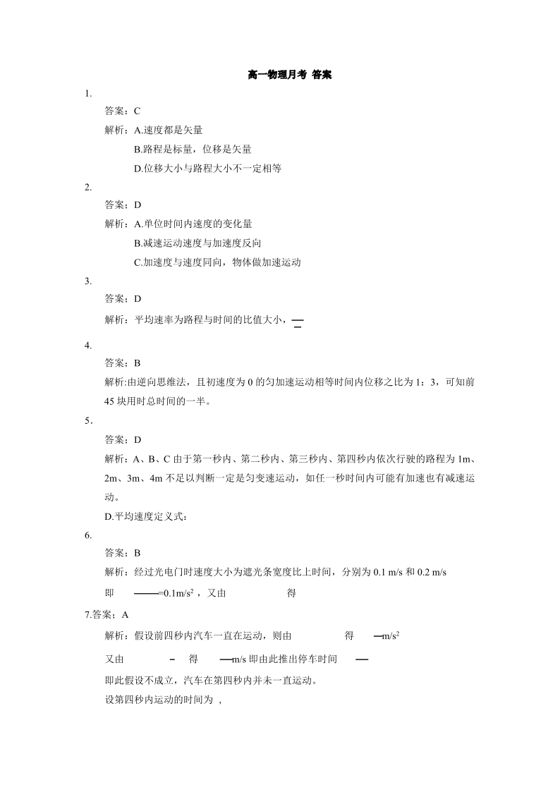 重庆市巴蜀中学校2023-2024学年高一上学期10月月考物理答案