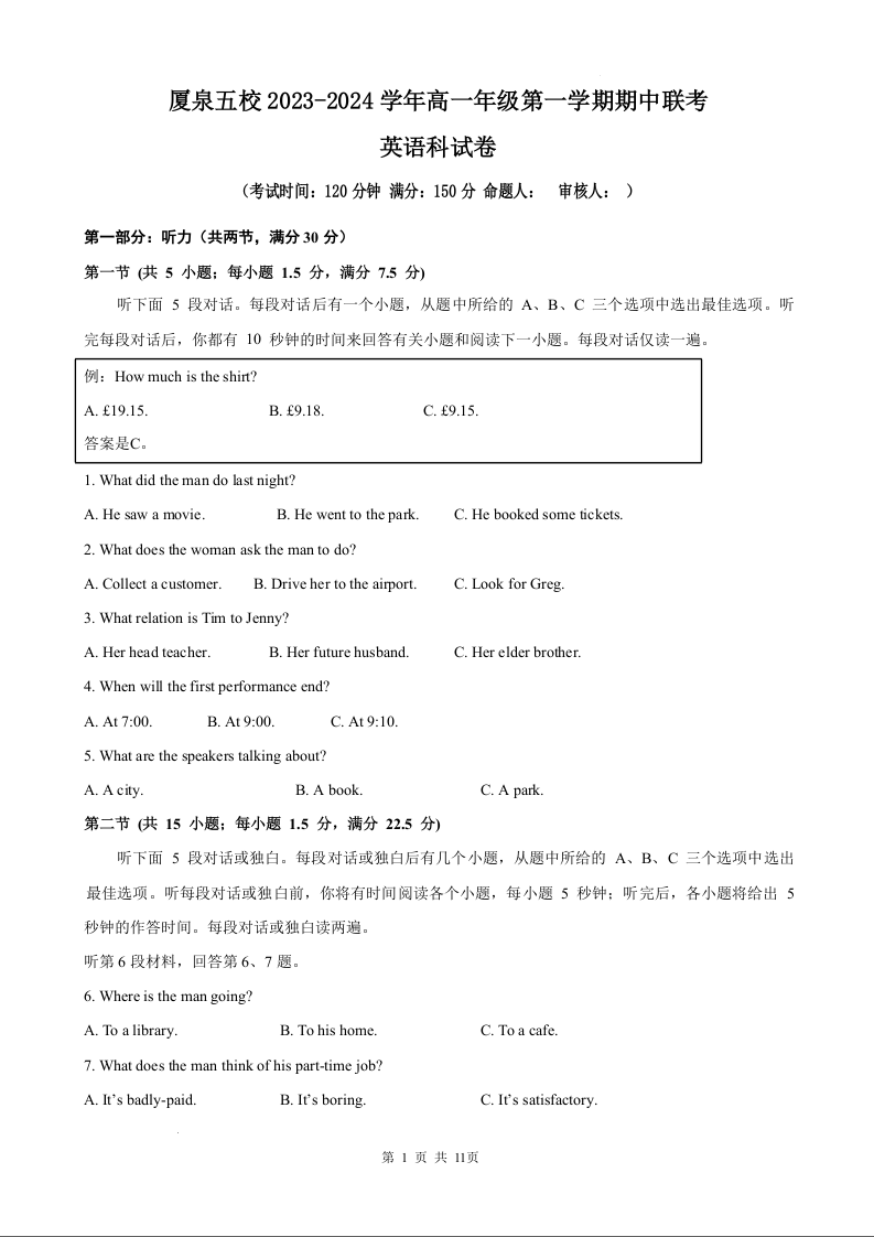 福建省夏泉五校联考2023-2024学年高一上学期11月期中考试英语