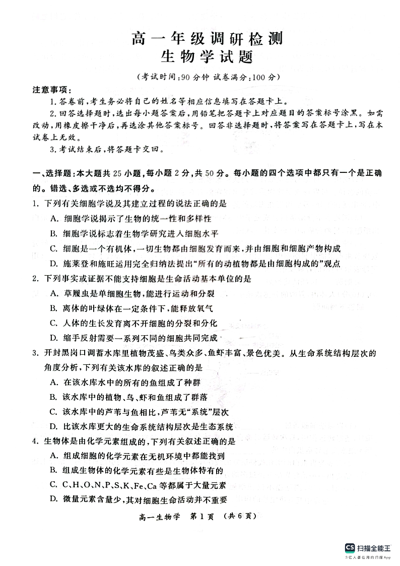 河南省开封市2023-2024学年高一上学期11月期中考试生物