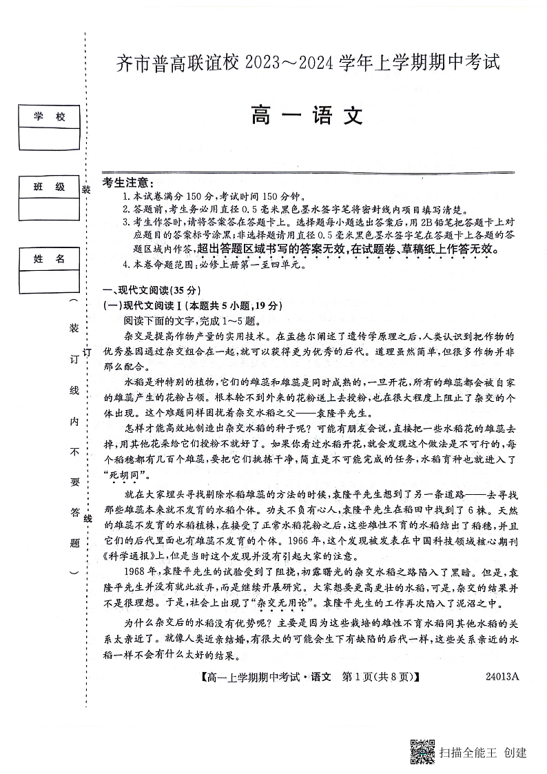 黑龙江省齐齐哈尔市2023-2024学年高一上学期10月期中考试语文