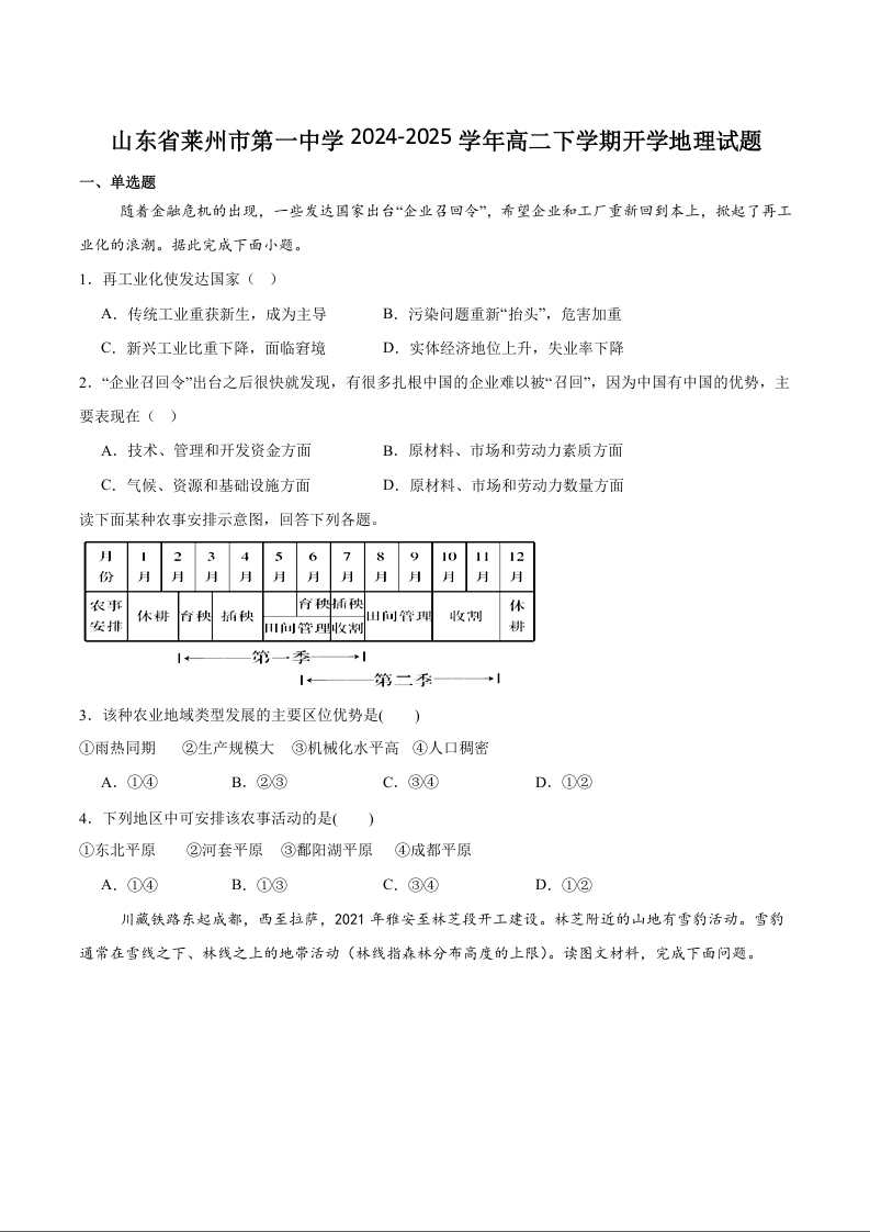 山东省莱州市第一中学2024-2025学年下学期高二开学考试地理+答案