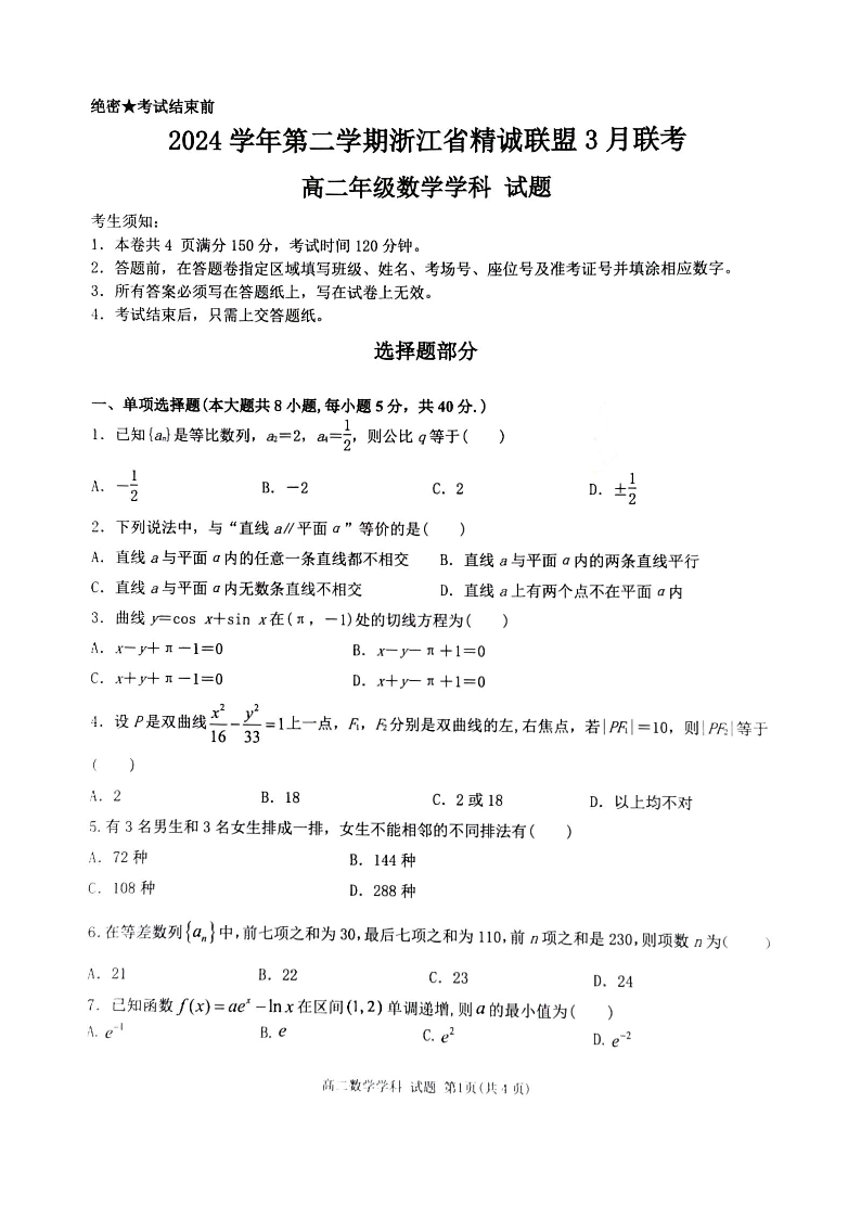 浙江省精诚联盟2024-2025学年下学期3月高二月考数学