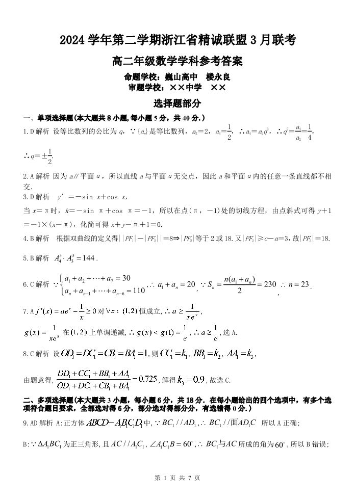 浙江省精诚联盟2024-2025学年下学期3月高二月考数学答案