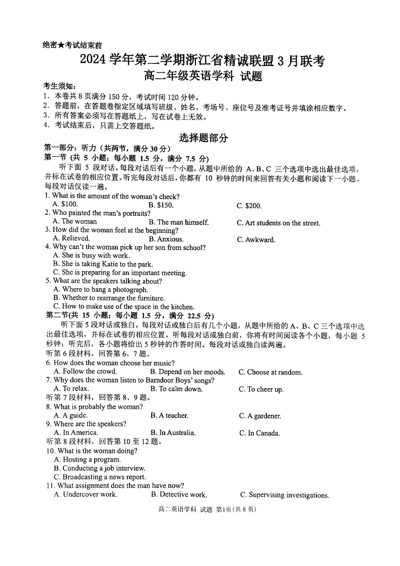 浙江省精诚联盟2024-2025学年下学期3月高二月考英语