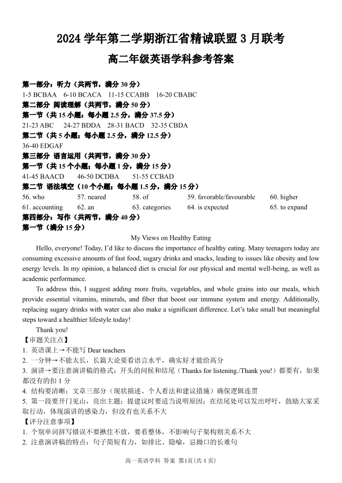 浙江省精诚联盟2024-2025学年下学期3月高二月考英语答案