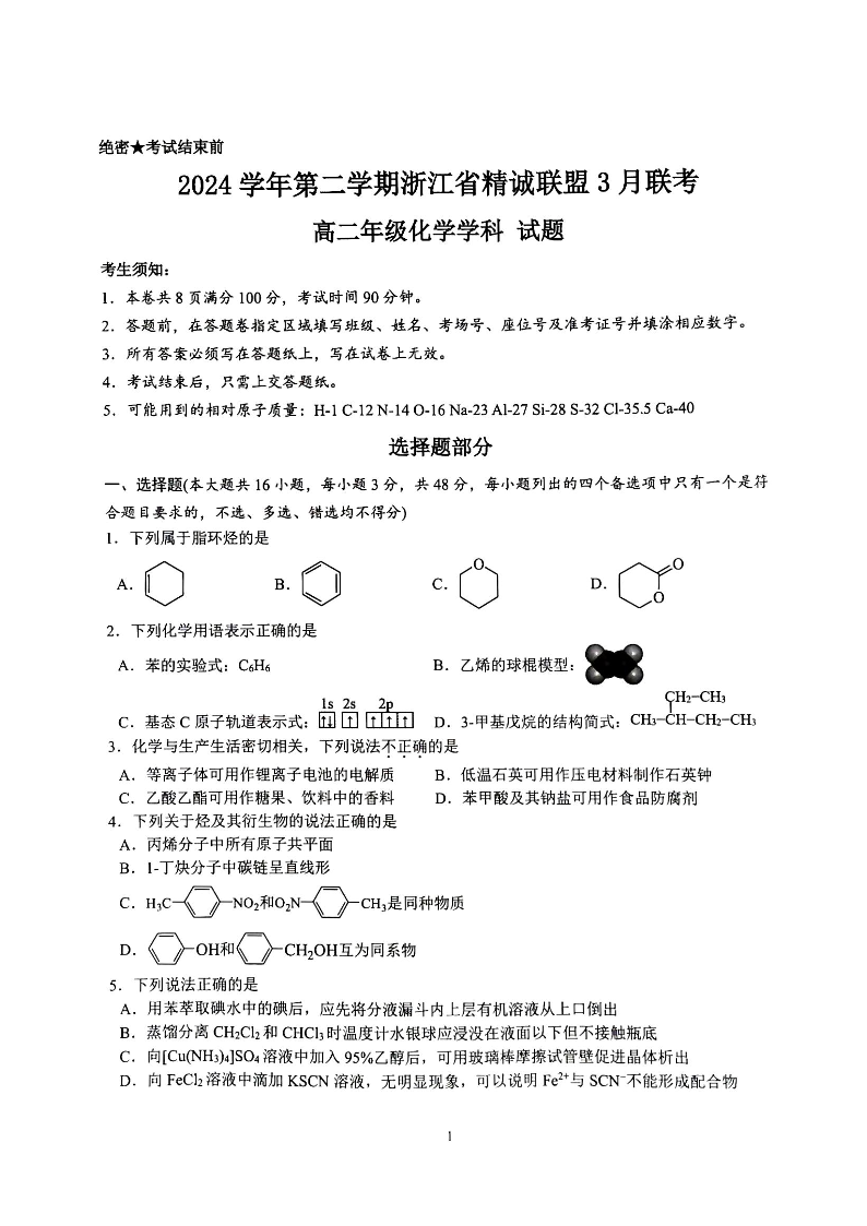 浙江省精诚联盟2024-2025学年下学期3月高二月考化学