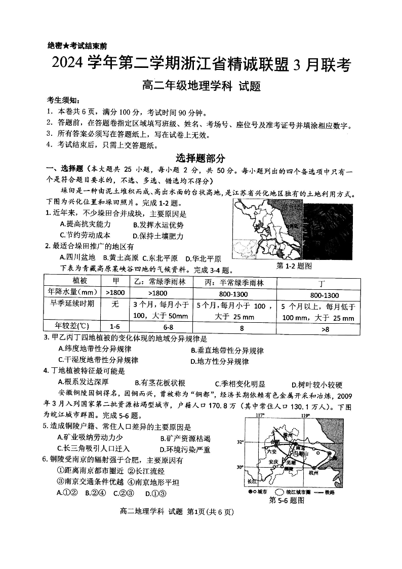 浙江省精诚联盟2024-2025学年下学期3月高二月考地理