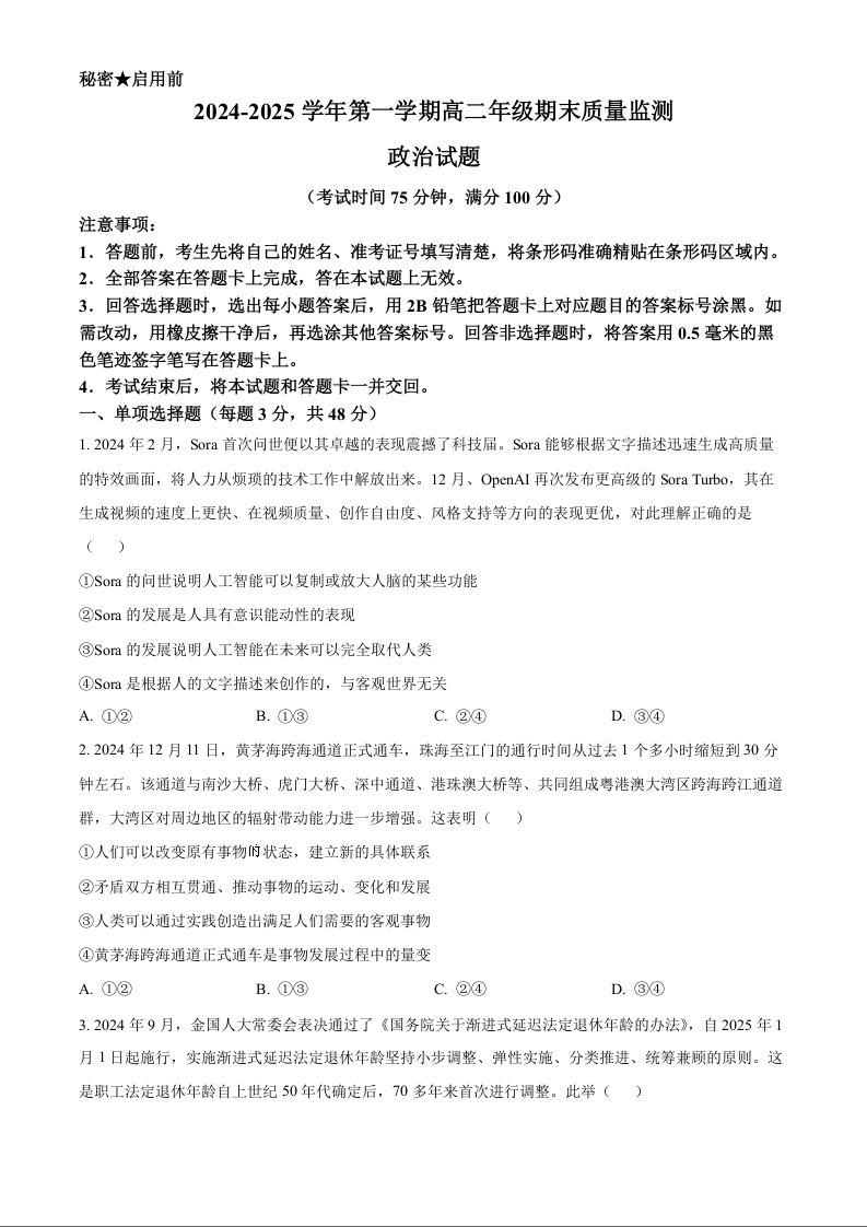 山西省阳泉市2024-2025学年上学期1月高二期末考试政治+答案