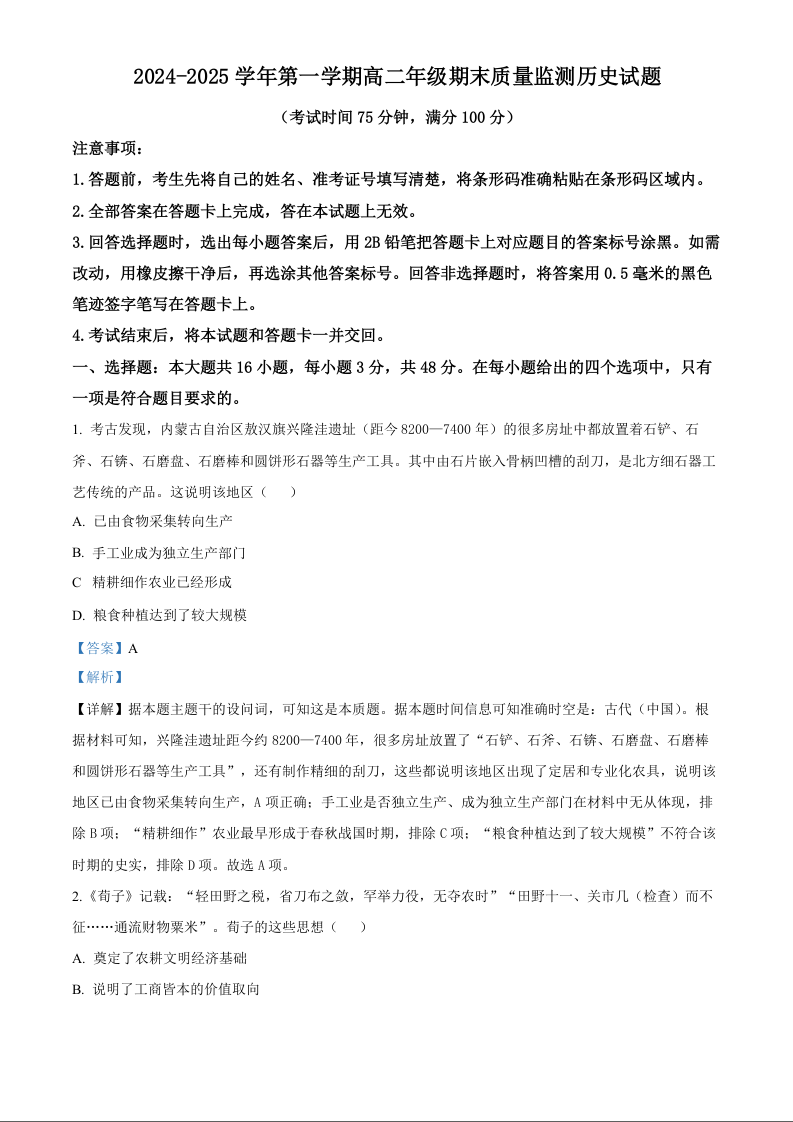 山西省阳泉市2024-2025学年上学期1月高二期末考试历史(解析版)