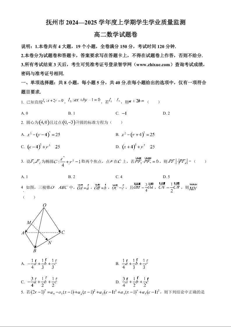 江西省抚州市2024-2025学年上学期1育人高二期末考试数学(原卷版)