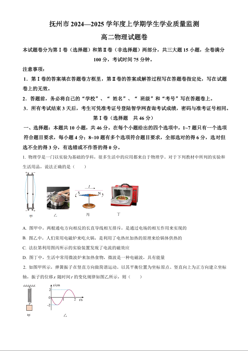 江西省抚州市2024-2025学年上学期1育人高二期末考试物理(原卷版)