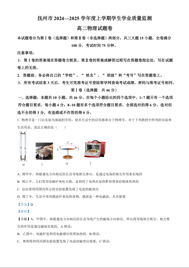 江西省抚州市2024-2025学年上学期1育人高二期末考试物理(解析版)
