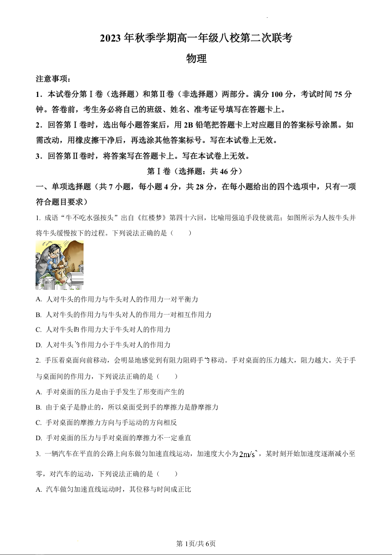 广西壮族自治区河池市八校2023-2024学年高一上学期第二次联考物理(原卷版)