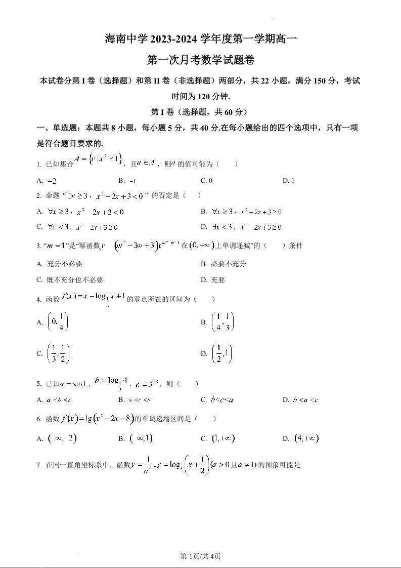 海南省海口市海南中学2023-2024学年高一上学期12月月考数学(原卷版)