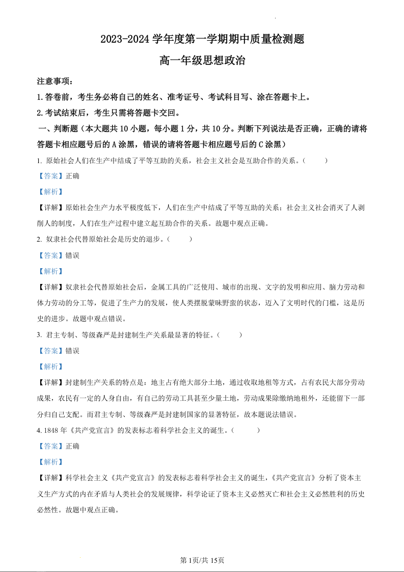 陕西省宝鸡市金台区2023-2024学年高一上学期期中考试政治(精品解析版)