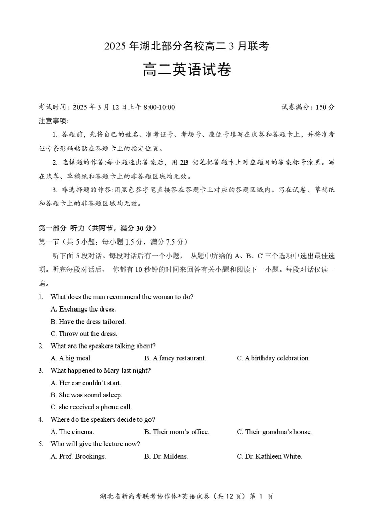 湖北省部分名校2024-2025学年下学期3月高二联考英语