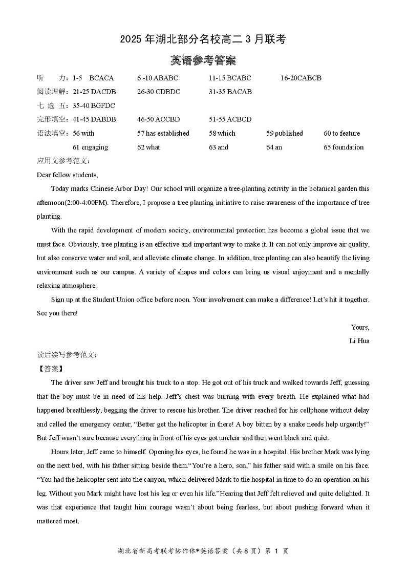 湖北省部分名校2024-2025学年下学期3月高二联考英语答案