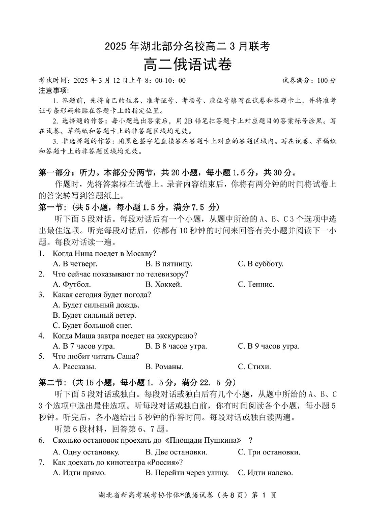 湖北省部分名校2024-2025学年下学期3月高二联考俄语