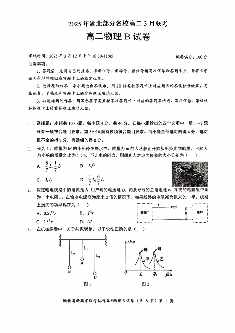 湖北省部分名校2024-2025学年下学期3月高二联考物理B