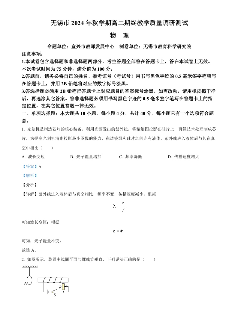 江苏省无锡市2024-2025学年上学期1月高二期末考试物理(解析版)