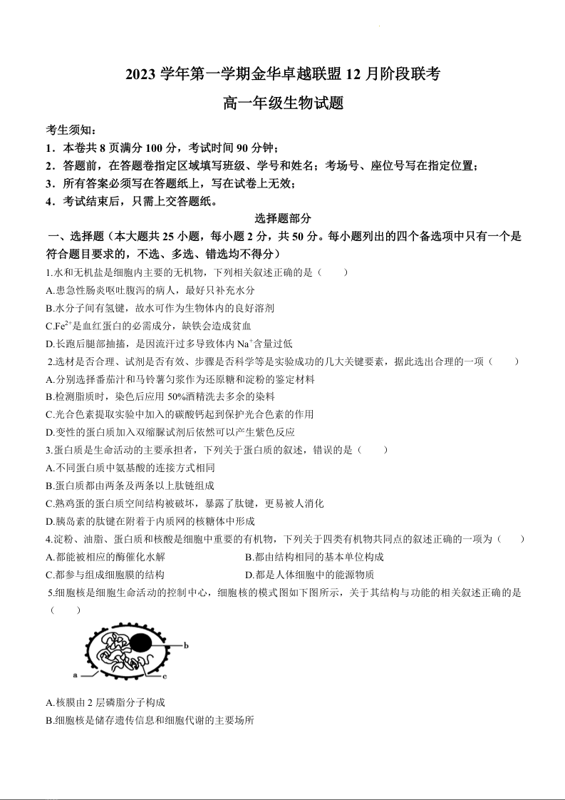 浙江省杭州市精诚联考2023-2024学年高一上学期12月月考生物