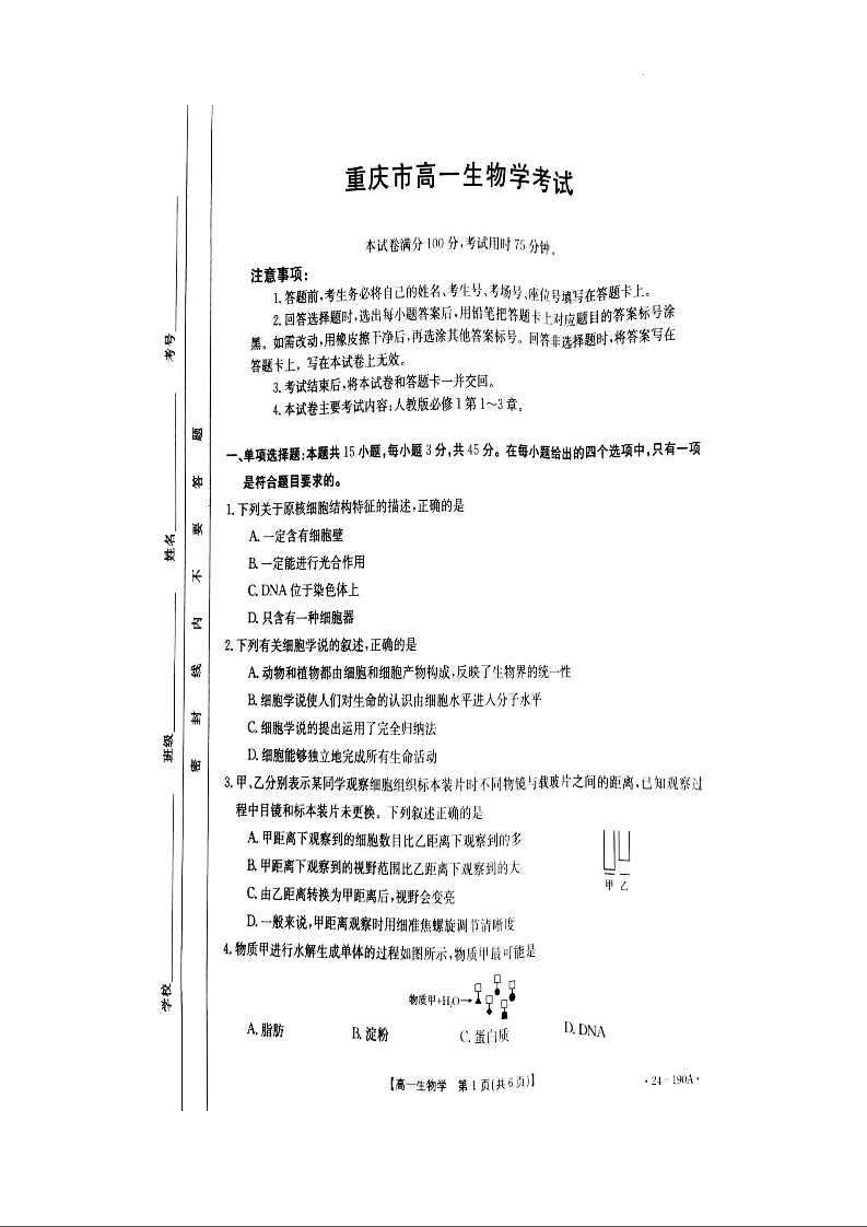 重庆市云阳县、梁平区等地 2023-2024学年高一上学期12月月考生物