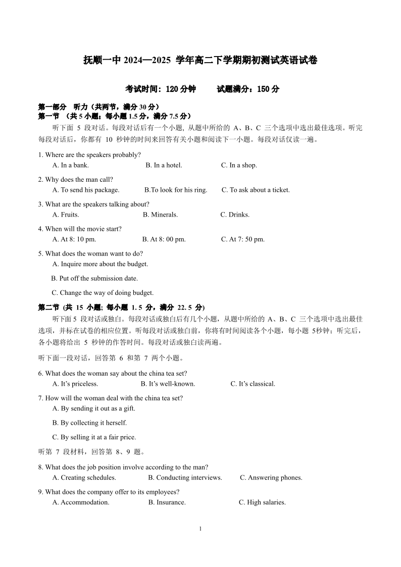 辽宁省抚顺市一中2024-2025学年下学期高二期初考试英语+答案