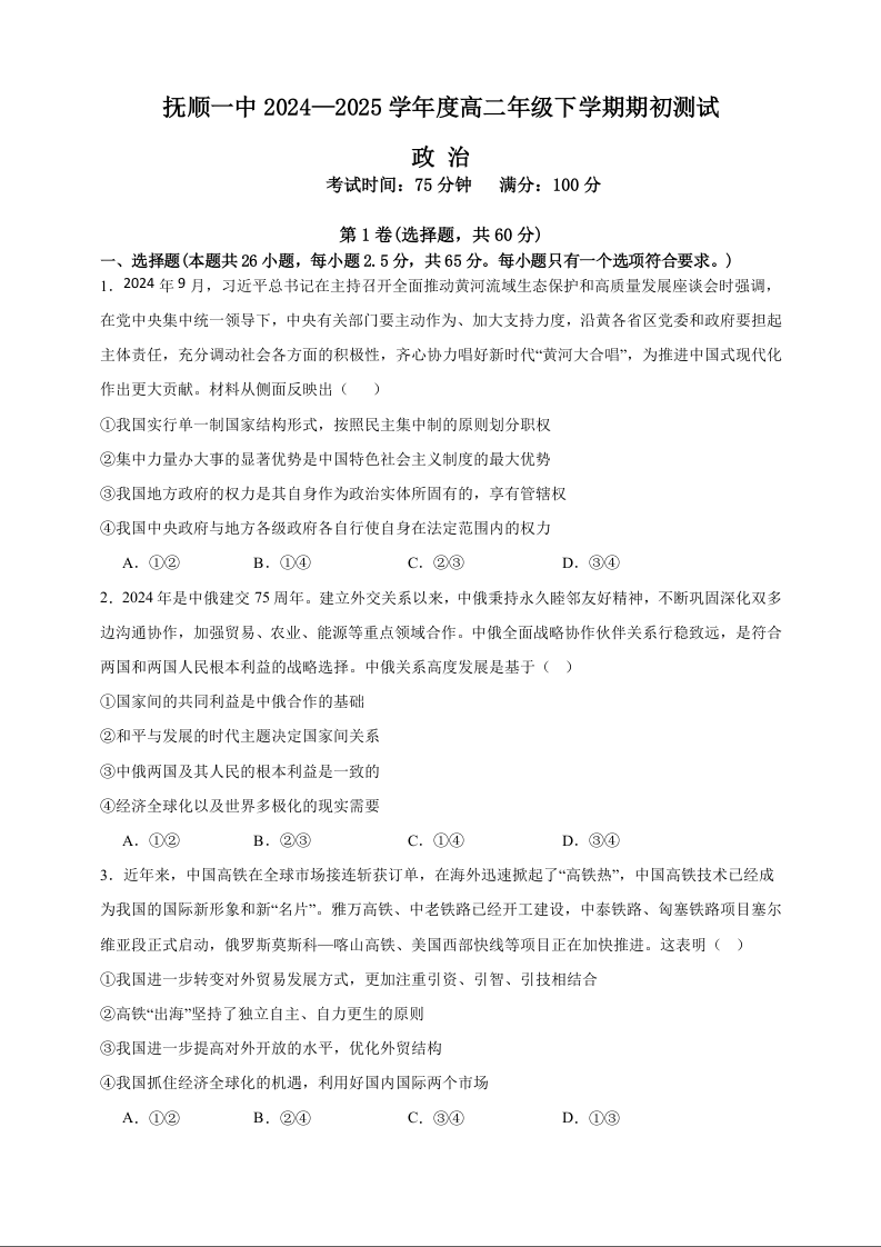 辽宁省抚顺市一中2024-2025学年下学期高二期初考试政治+答案