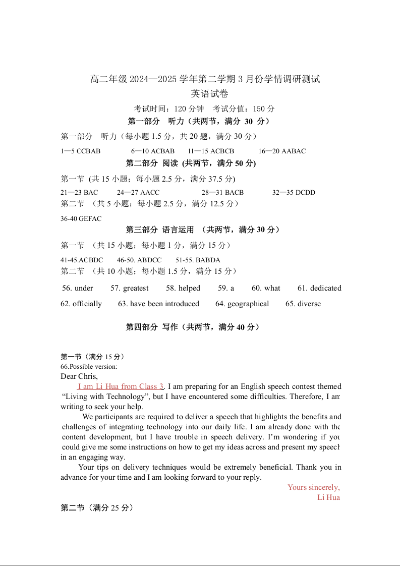 江苏省连云港市区域2024-2025学年下学期3月高二考试英语答案
