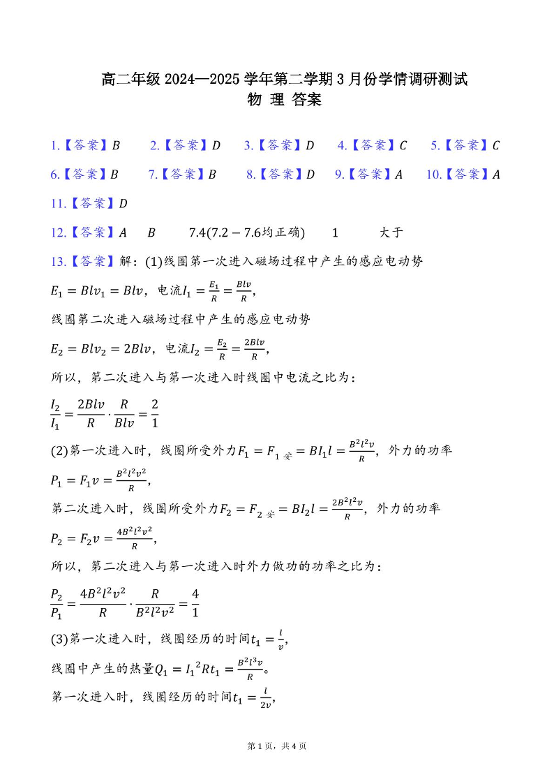 江苏省连云港市区域2024-2025学年下学期3月高二考试物理答案