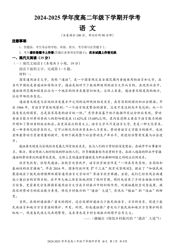 广西梧州市2024-2025学年下学期高二开学考试语文+答案