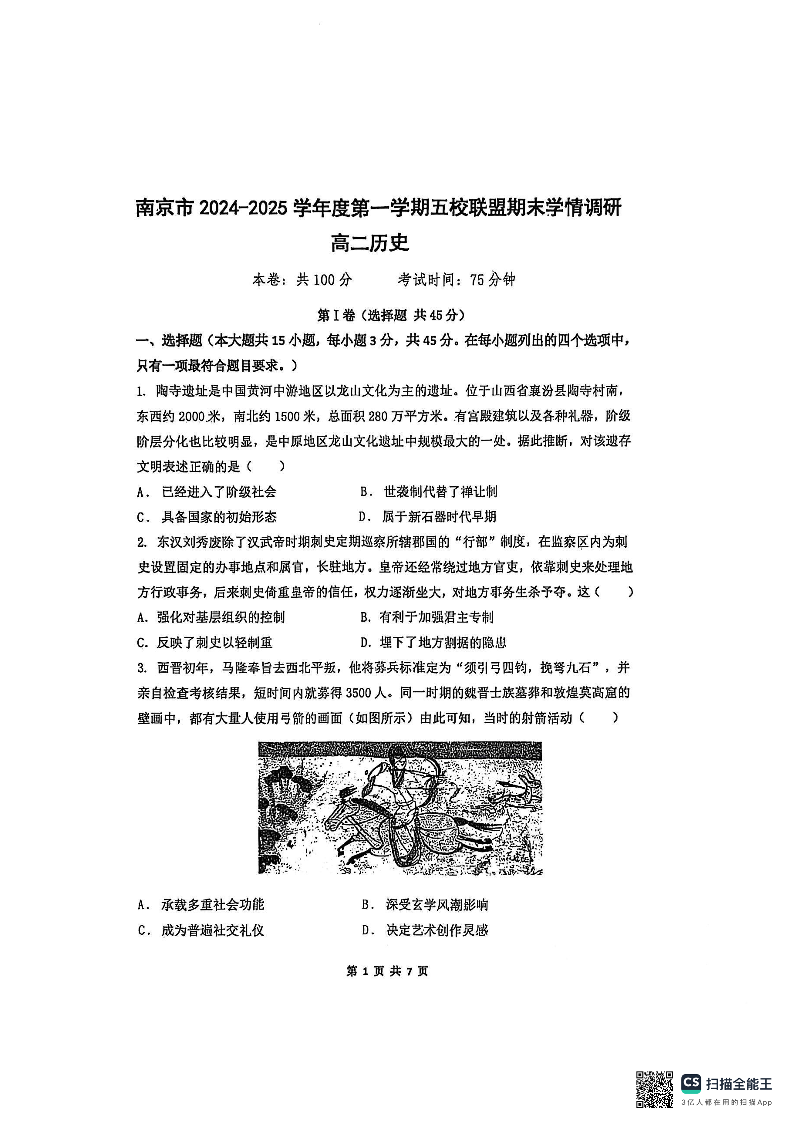 江苏省南京市五校联盟2024-2025学年上学期1月高二期末考试历史
