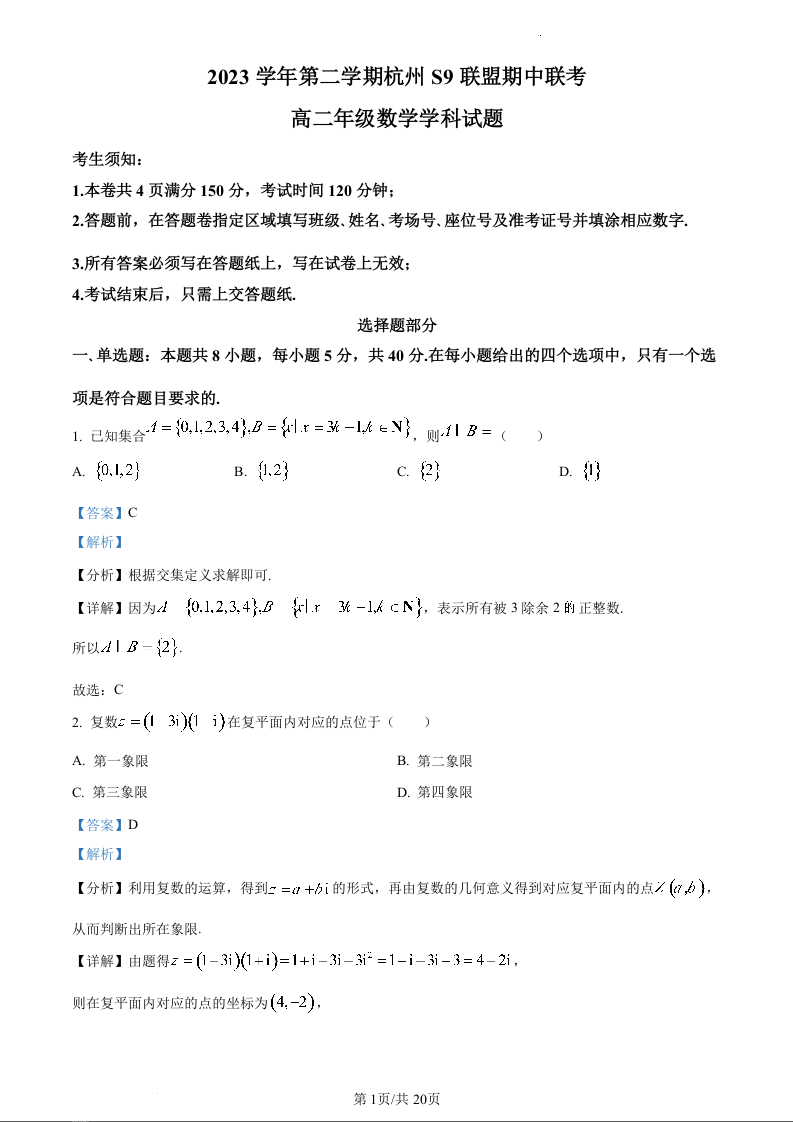 浙江省S9联盟2023-2024学年高二下学期4月期中考试数学(精品解析版)