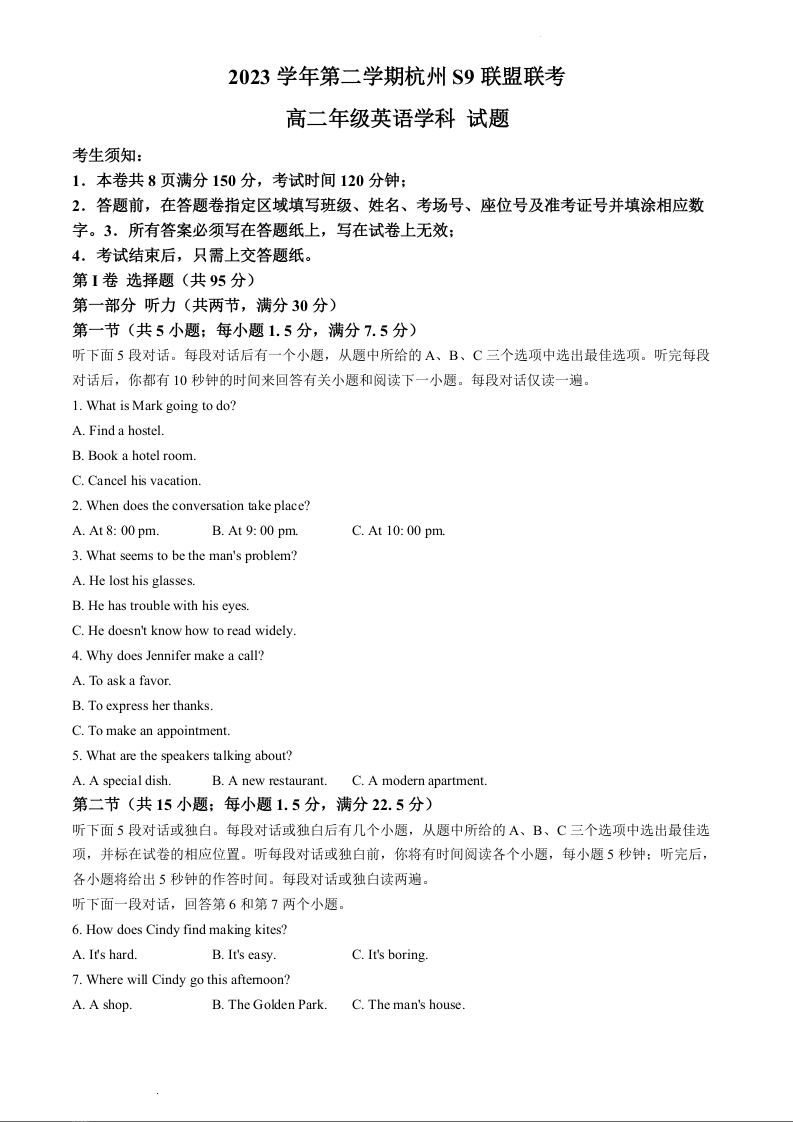 浙江省S9联盟2023-2024学年高二下学期4月期中考试英语+答案
