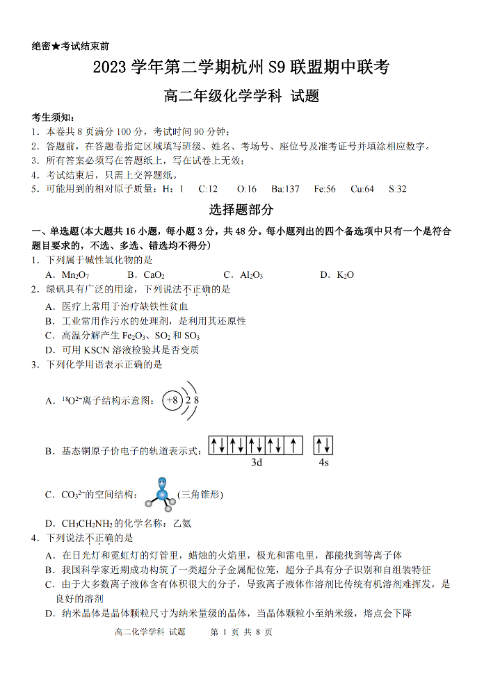 浙江省S9联盟2023-2024学年高二下学期4月期中考试化学