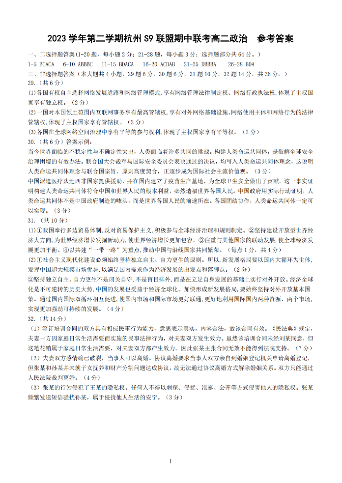 浙江省S9联盟2023-2024学年高二下学期4月期中考试政治答案