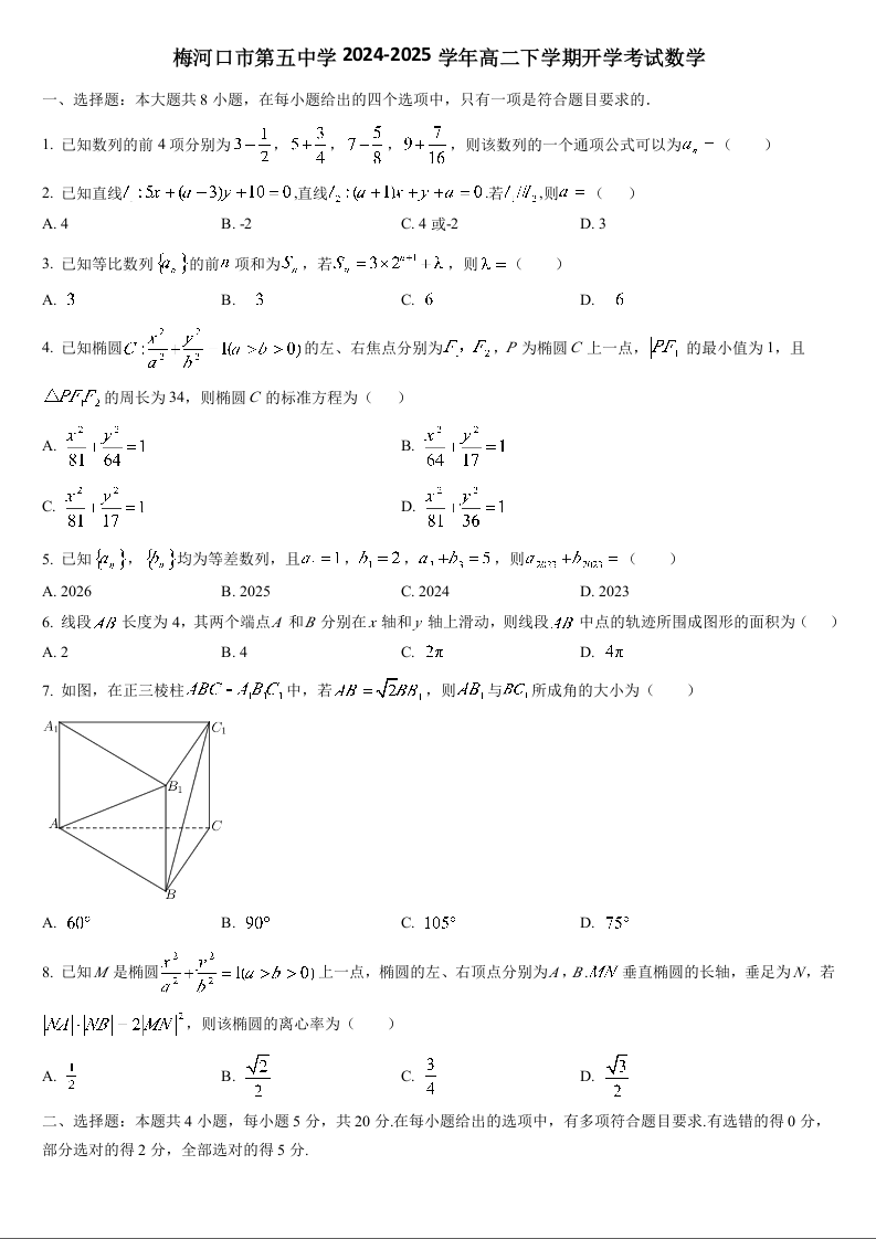 吉林省梅河口市第五中学2024-2025学年下学期高二开学考试数学+答案