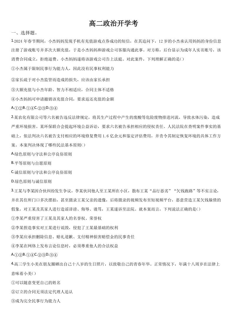 吉林省梅河口市第五中学2024-2025学年下学期高二开学考试政治+答案
