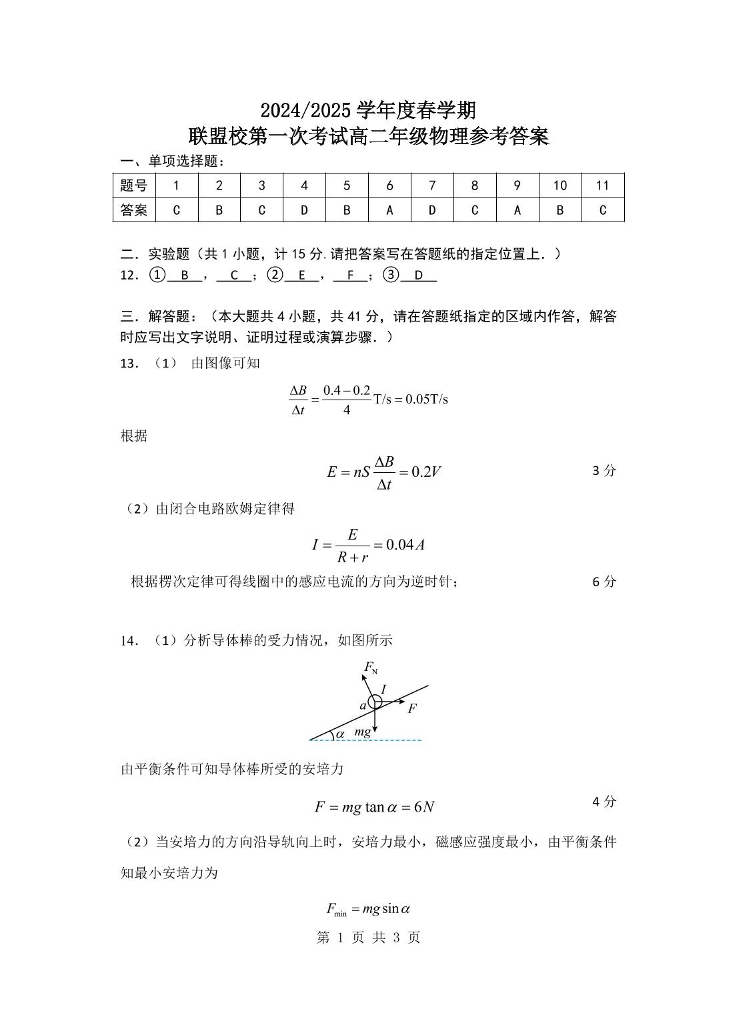 江苏省盐城市五校2024-2025学年下学期3月高二第一次联考物理答案