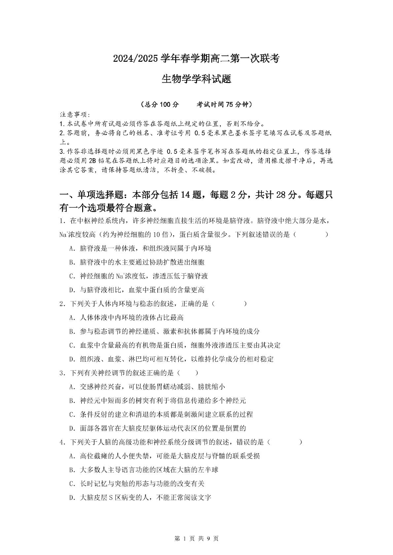 江苏省盐城市五校2024-2025学年下学期3月高二第一次联考生物学
