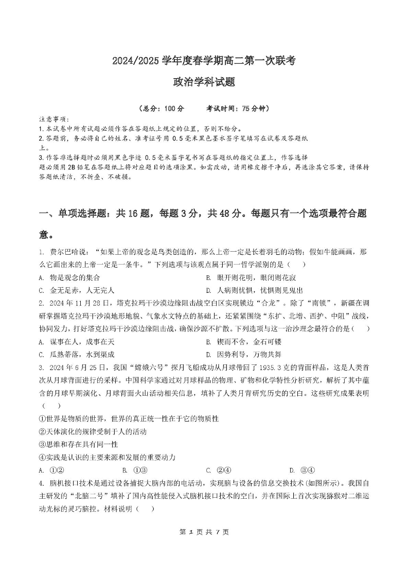 江苏省盐城市五校2024-2025学年下学期3月高二第一次联考政治