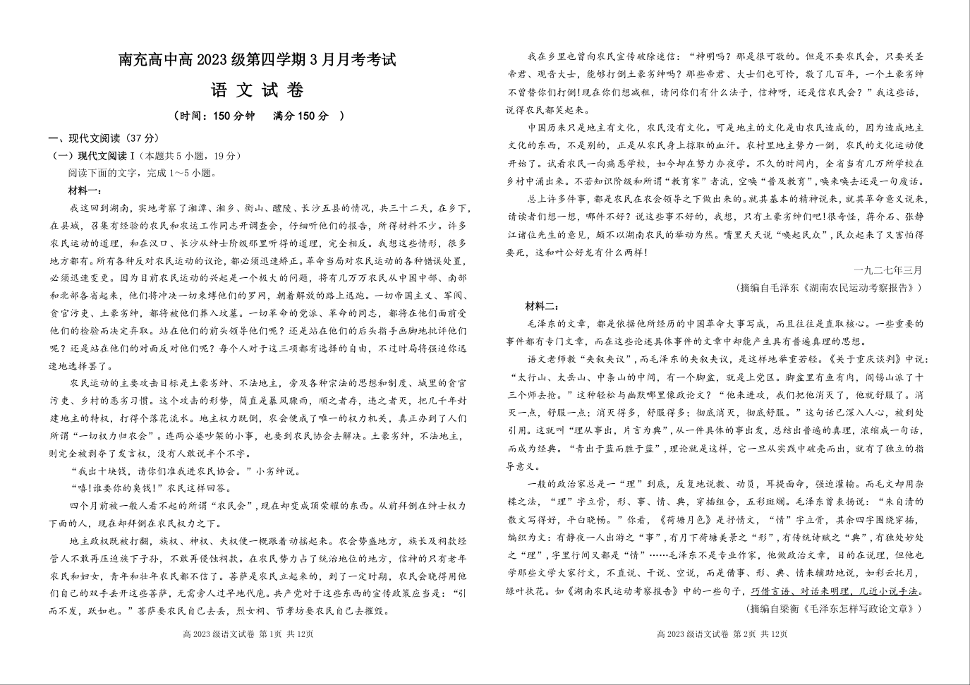 四川省南充市高级中学2024-2025学年下学期3月高二月考语文