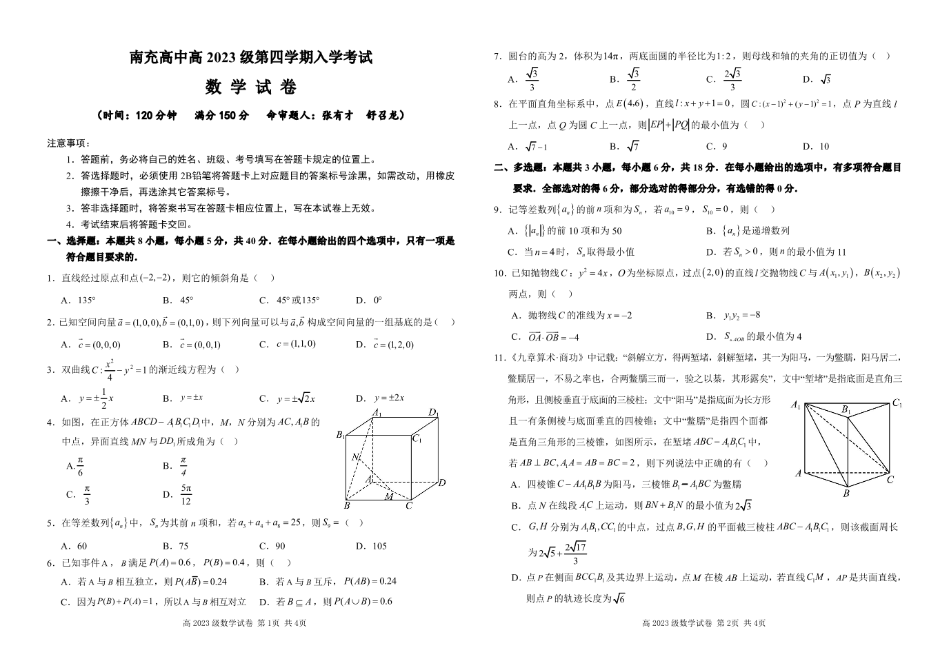 四川省南充市高级中学2024-2025学年下学期3月高二月考数学