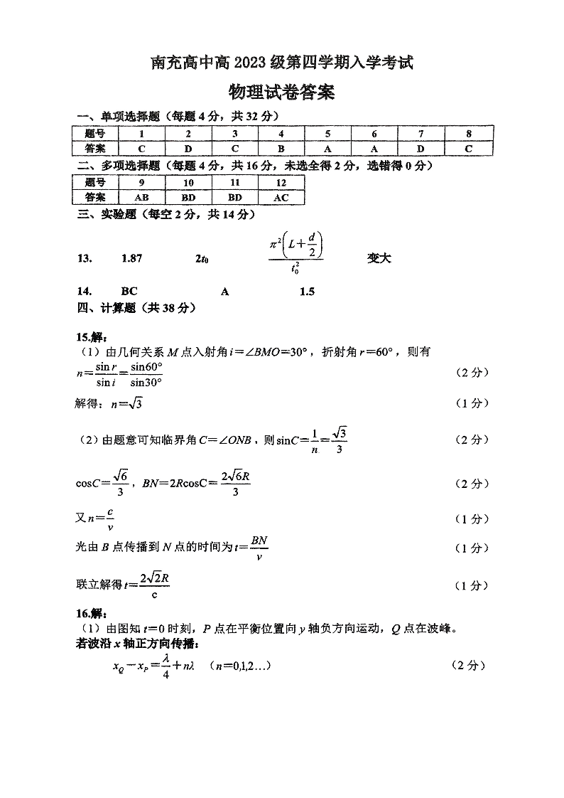 四川省南充市高级中学2024-2025学年下学期3月高二月考物理答案