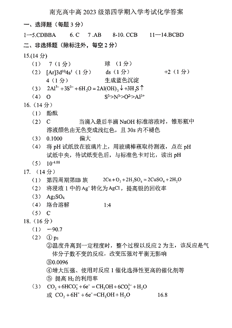 四川省南充市高级中学2024-2025学年下学期3月高二月考化学答案