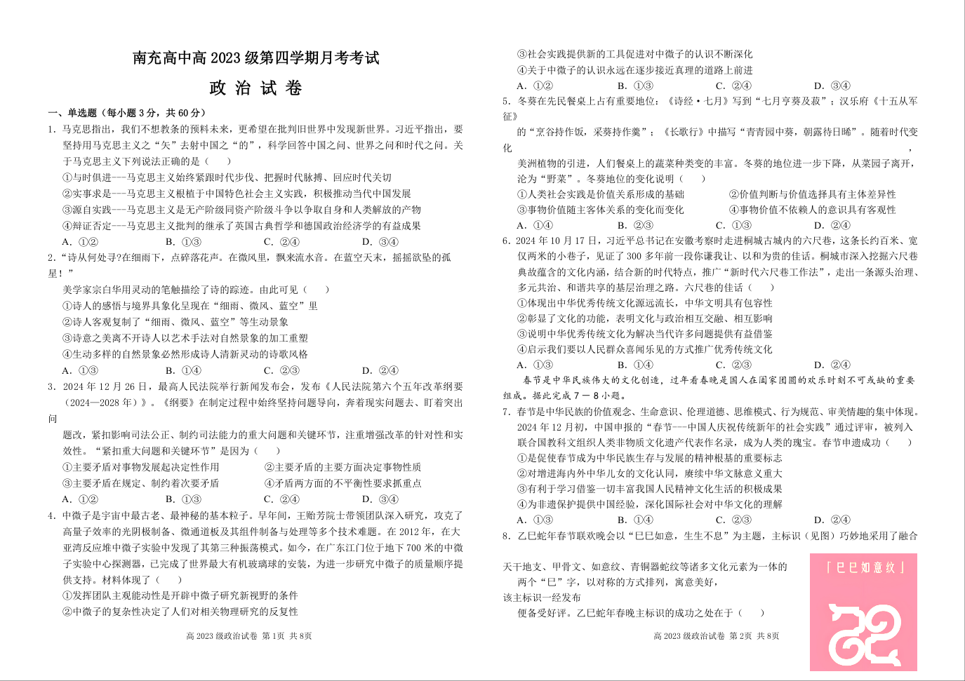 四川省南充市高级中学2024-2025学年下学期3月高二月考政治