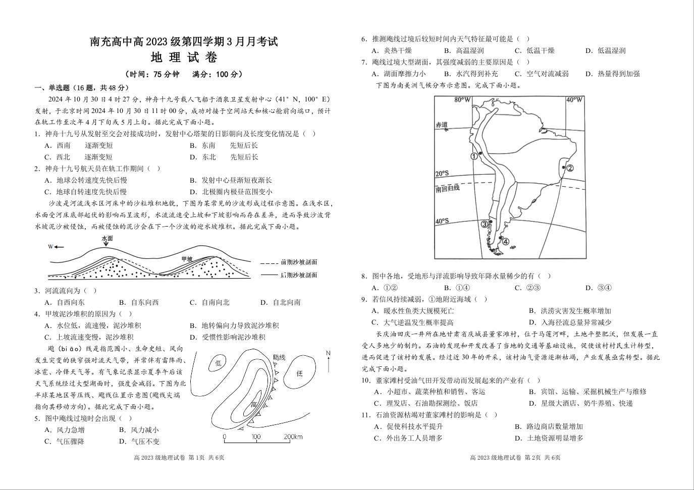 四川省南充市高级中学2024-2025学年下学期3月高二月考地理