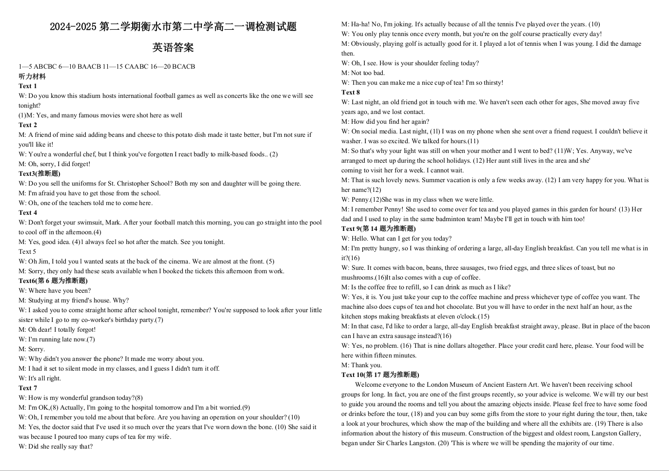 河北省衡水市第二中学2024-2025学年下学期高二第一次调考英语答案
