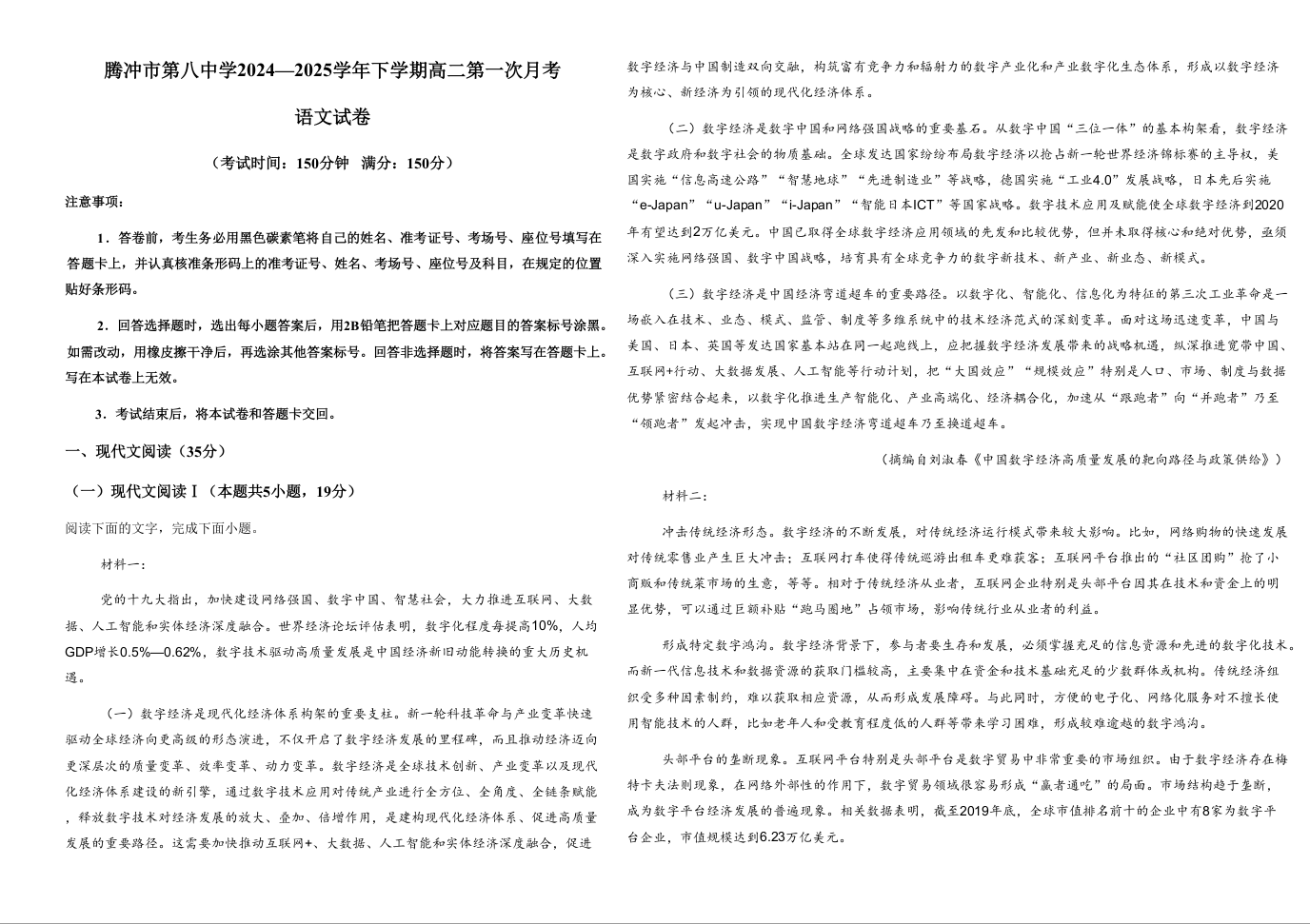 云南省保山市腾冲八中2024-2025学年下学期3月高二月考语文+答案