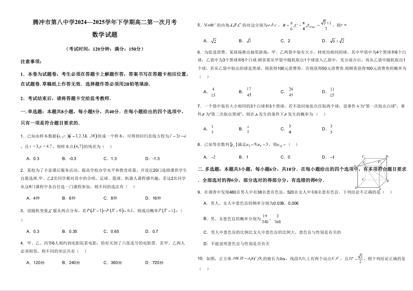 云南省保山市腾冲八中2024-2025学年下学期3月高二月考数学+答案